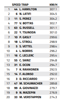 最下部にスピードトラップを掲載。ハミルトンがずば抜けている。