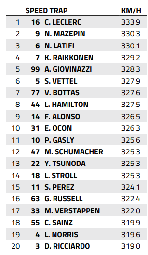 ・最高速度はルクレールがトップ。他車より抜き出ていてDRS+トウを得たと考えられる。