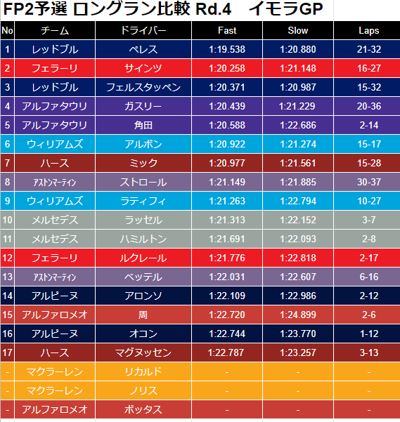 ・スプリント予選ではよい走りをしていたこととFP2のミディアムのタイムも悪くはないことから、決勝での活躍に期待したい。