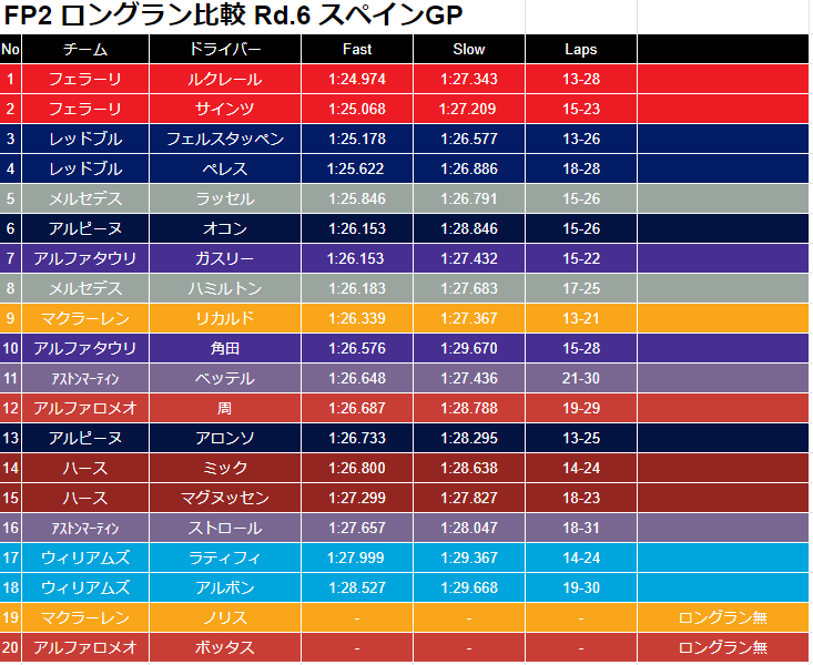 ・開幕当初はポイント争い上位に絡んでいたアルファロメオとハースだがFP2のロングラン上は、他チームのアップデートもあってかポイント争いが苦しい可能性がある。